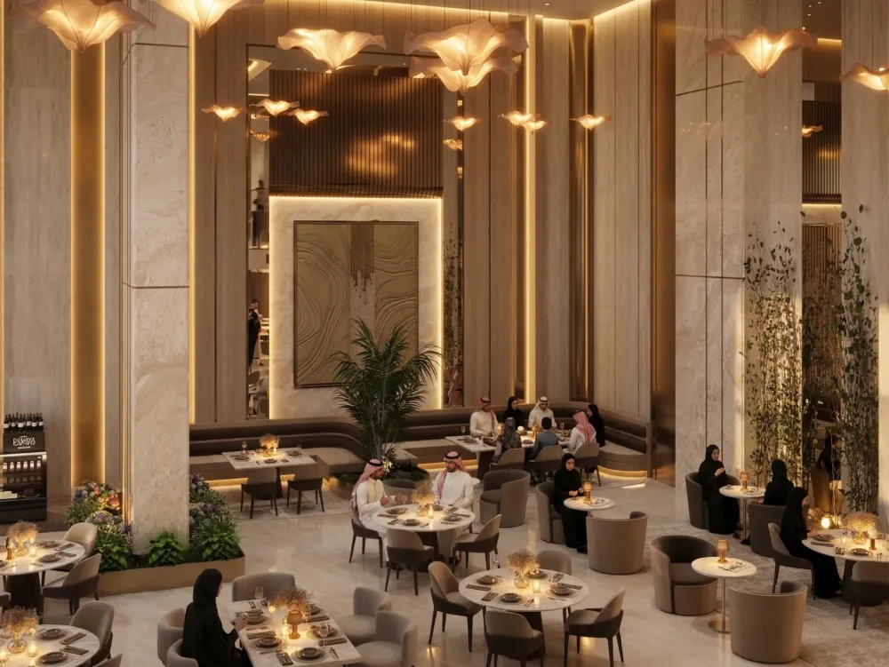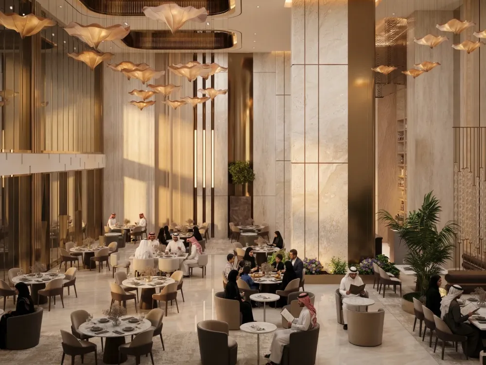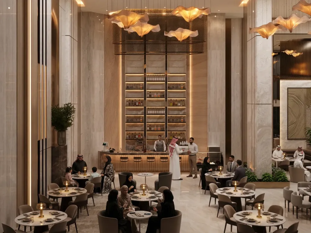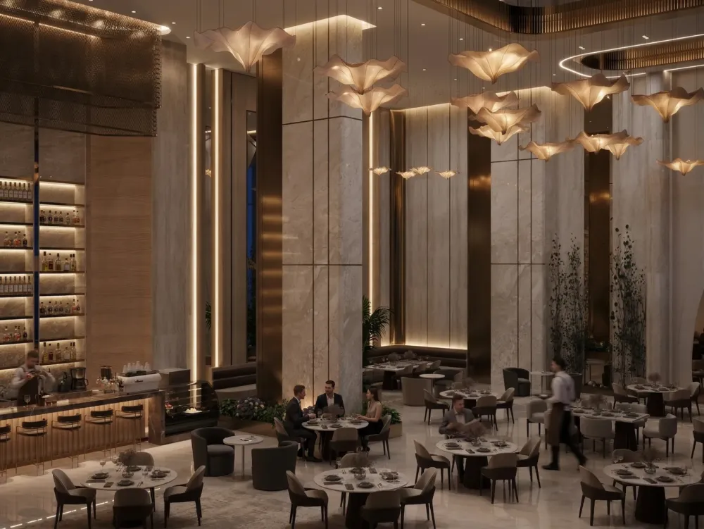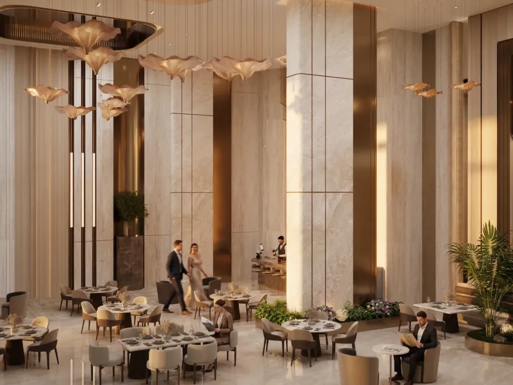 “Elegant, high-end hospitality interior blending classical monumentality with contemporary minimal luxury.”