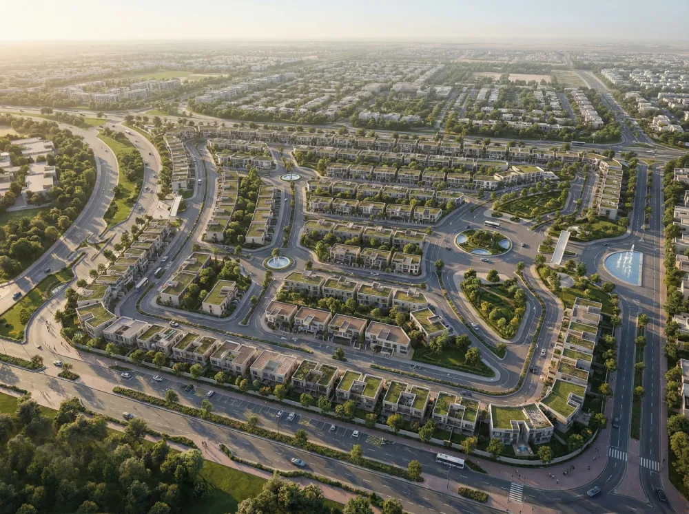 The city is structured along a hierarchical road network with roundabouts and landscaped boulevards serving as urban anchors.