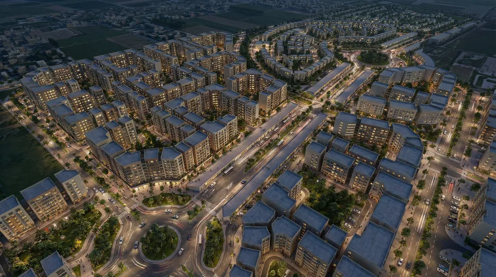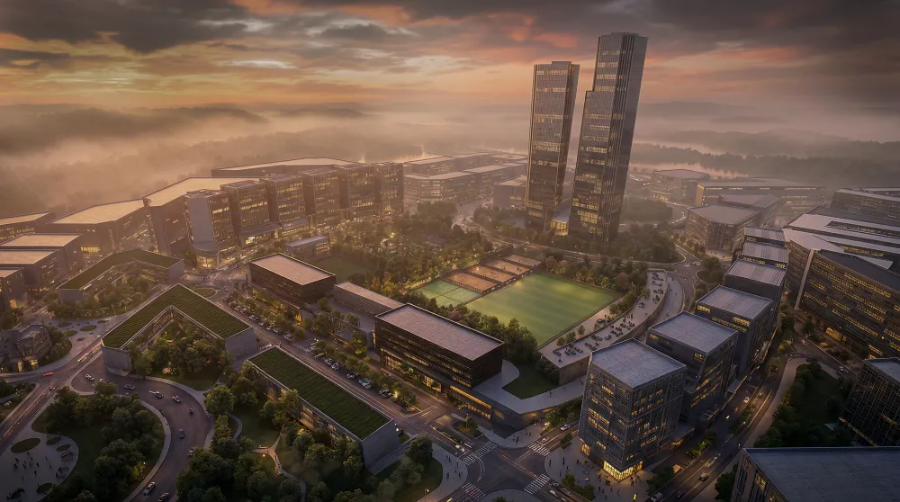 - Central Landmark Axis: A grand boulevard leading to twin towers and a central business hub, establishing a strong urban identity.