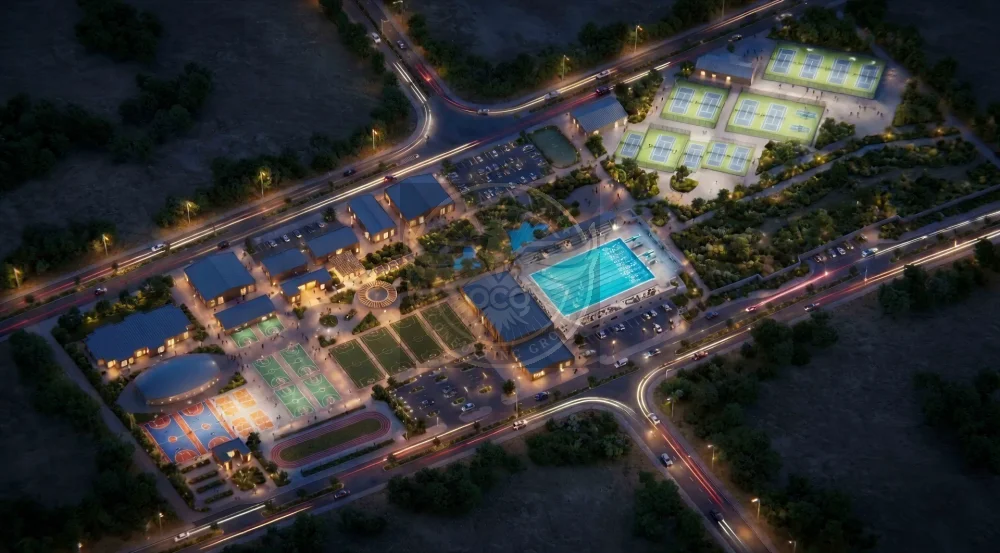 The project represents a modern multi-functional sports and community complex, designed as an integrated campus that combines athletic facilities, social spaces, and supporting amenities within a cohesive landscape environment.