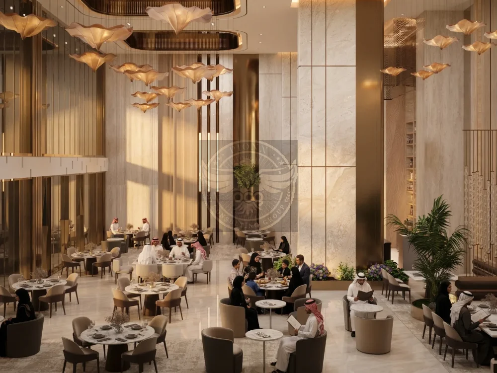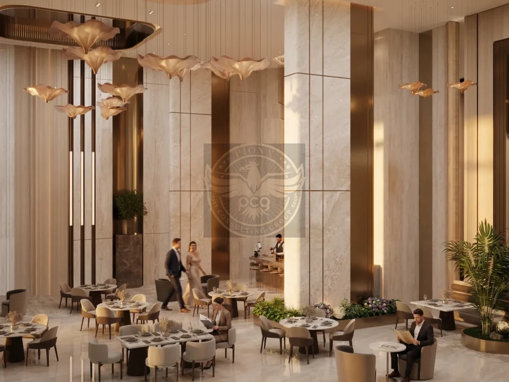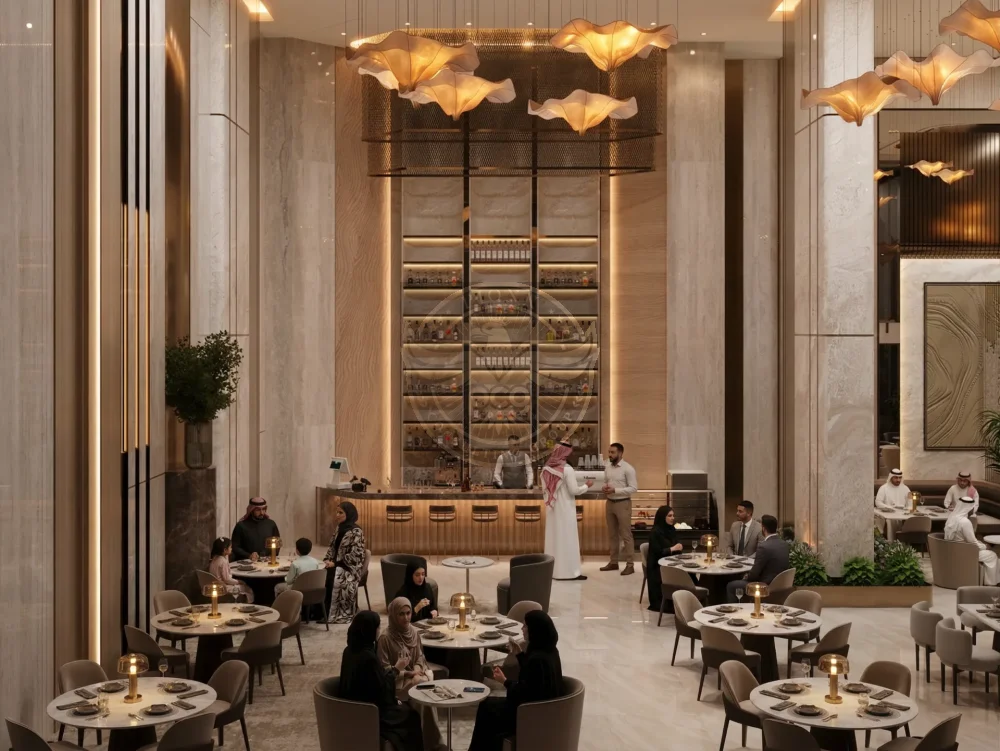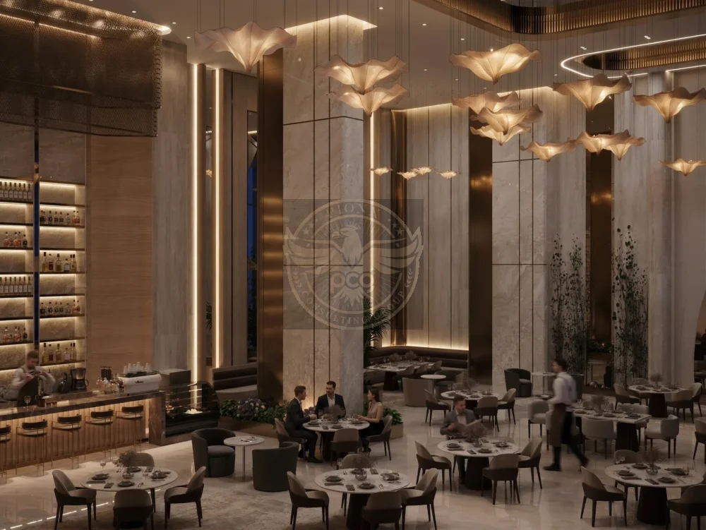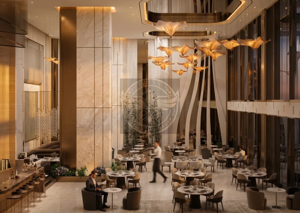 “Elegant, high-end hospitality interior blending classical monumentality with contemporary minimal luxury.”
