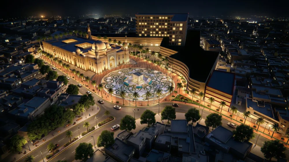 The design celebrates the spiritual, historical, and social significance of the mosque, positioning it as the visual and symbolic focal point at the end of a grand axial promenade.