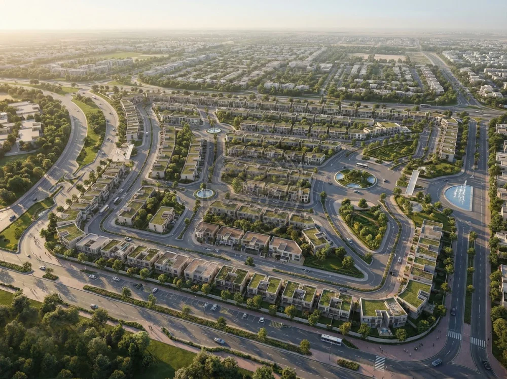 The master plan prioritizes green infrastructure, with tree-lined avenues, central parks, and community green spaces woven throughout.