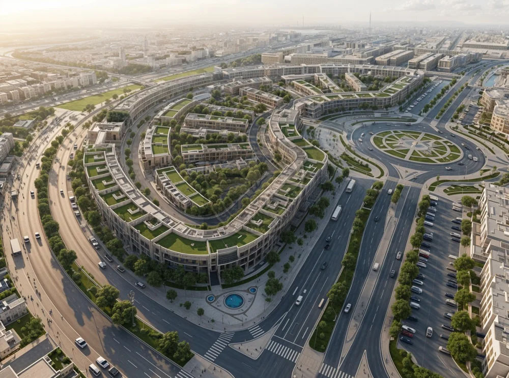 - Radial and curved layouts in residential districts create neighborhood identities while ensuring smooth vehicular circulation.